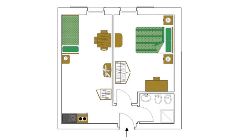 Questa sistemazione è composta da camera matrimoniale e da zona giorno con un letto singolo, tavolo, sedie e mini angolo cottura (piccolo frigorifero capacità 50 lt., piastra cottura a induzione, stoviglie) e bagno privato.